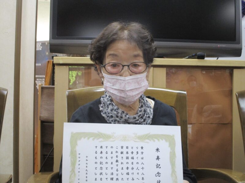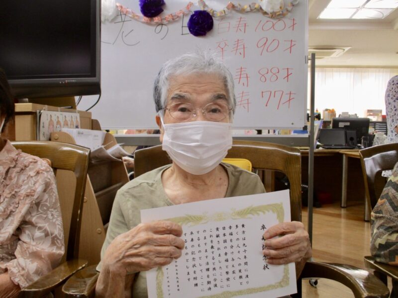 式典では、米寿・白寿を迎えられた皆様の表彰を行い、スタッフから賞状ともに感謝の気持ちをお贈りしました。